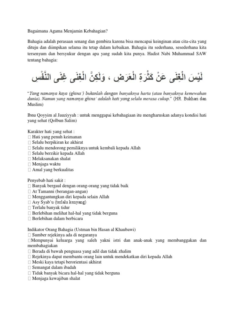 Agama " bagaimana agama menjamin kebahagiaan dunia dan kesalamatan akhirat " disusun oleh. Kontribusi agama dalam mencapai kebahagiaan dari materi yang sudah anda pelajari pada bab ini yaitu agama . Coba anda lakukan analisis kritis tentang pengertian dan makna bahagia! Atas ingin mengkaji lebih banyak mengenai kebahagiaan khususnya cara agama islam dalam menjamin kebahagiaan umatnya. Bagaimana agama islam menjamin kebahagiaan umatnya.